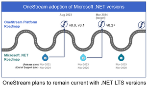 Let's talk .NET in non-technical terms and describe it's impact on OneStream Platform v8+ uprades. .NET is the development platform used by OneStream to build the Platform. Prior to Platform v8.0, OneStream used versions of .NET referred to as .NET Framework versions. The v7.x Platform release used .NET 4.8. The development of Platform v8.0 used .NET6, referred to as a .NET Core version. The .NET Core versions leverage modern development paradigms and are much faster! OneStream customers upgrading to Platform v8+ are observing performance improvements in memory intensive operations such as Consolidation processing, and several data loading / copying processes. The modern paradigms of .NET Core had an impact on OneStream Business Rule compilation - older syntax and library references that were not .NET Core compatible failed compilation. This required some minor updates to MP Solutions and customer created Business Rules. No sweat - a one time adjustment with your pre-v8 to v8+ Platform upgrade. OneStream plans to follow Microsoft's Long Term Support (LTS) release cadence for .NET Core versions - every two years. Platform v8.0 and Platform v8.1 used .NET6. The next two years of releases beginning with Platform v8.2, we will use .NET8. See the chart below: OneStream customers must ensure all desktop/laptops providing Windows Client access to OneStream have the corresponding version of .NET Desktop Runtime installed. With v8.0 and v8.1, we recommended version 6.0.14 or higher (within the 6,x line). With v8.2 (target late March 2024), we recommend version 8.0.2 or higher (within the 8.x line). Note: The OneStream Windows Client WILL NOT connect to a v8.0 or v8.1 Server without the existence of a version 6.x of the .NET Desktop Runtime. In other words, a .NET8 Desktop Runtime install isn't 'backwards' compatible. However, .NET8 and .NET6 Desktop runtimes may co-exist together and live in harmony 🙂 See the Microsoft .NET page for support dates and downloads. Notice that Microsoft has indicated an End-of-Service date for .NET6 at November 2024. After this date, Microsoft will not issue patches for issues related to .NET6. OneStream recommends maintaining compliance with Microsoft's .NET support dates - therefore customers running Platform v8.0 or v8.1 should plan an upgrade to Platform v8.2 or higher by the end of 2024. OneStream is targeting Platform releases in March, July, and November of 2024. Platform upgrades from v8+ to higher versions follow tranditional (simple!) upgrade processes. See the chart below to see the .NET6 End of Service impact: We hope this information provides you insightful background on all things .NET! If you have further questions or require clarification, feel free to add your comment in a reply below.16Views0likes0Comments