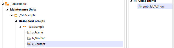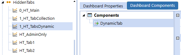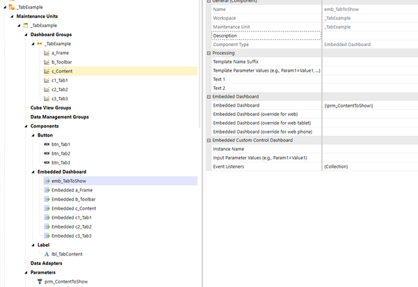 The manually created Embedded Dashboard will have your template parameters that control the display name (tab name) and a reference to the actual sub dashboard components to use