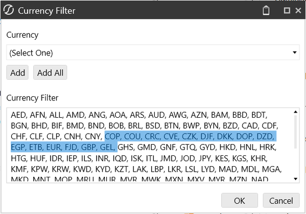 - For a mass update, use Notepad++ to create a new list to copy/paste into "Currency Filter" box.