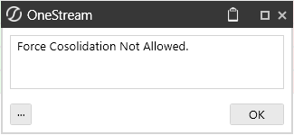 Namespace OneStream.BusinessRule.WcfEventHandler.WcfEventHandler Public Class MainClass Public Function Main(ByVal si As SessionInfo, ByVal globals As BRGlobals, ByVal api As Object, ByVal args As WcfEventHandlerArgs) As Object Try Dim returnValue As Object = args.DefaultReturnValue args.UseReturnValueFromBusinessRule = False args.Cancel = False If ( args.IsBeforeEvent And ScenarioDimHelper.GetNameFromID(si, si.WorkflowClusterPk.ScenarioKey) = "Actual" And (args.OperationName = "Calculate" Or args.OperationName = "StartConsolidation") ) Then Dim isForced As Boolean = args.inputs(2) If( isForced ) Throw New XFException(si, New Exception("Force Cosolidation Not Allowed.")) Else Return returnValue End If End If Return returnValue Catch ex As Exception Throw ErrorHandler.LogWrite(si, New XFException(si, ex)) End Try End Function End Class End Namespace