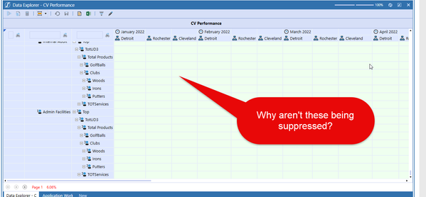 I have set all of the row suppressions to TRUE (except for parent suppression) in the CV Performance view from the lab, but when displaying the report, it still shows rows with no data, even by scrolling horizontally all the way to the end. Why would this be?