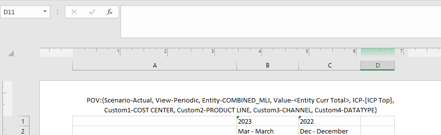 I am looking for something that dynamically updates based on the POV I set within an excel file through the quickview interface. When we were using HFM, we would use that POV formula to basically convert the info I have circled in the below screenshot to text that would refresh any time data was refreshed. This allowed a reviewer who was not in the system to have context for various support, even if it was just a printed sheet of paper.