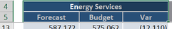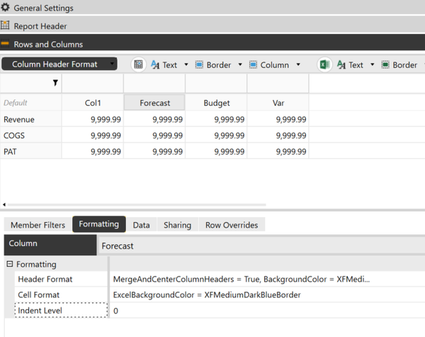 I'm using OneStream 8.2 and trying to merge 3 column headers (Forecast, Budget, Var) under one "|!Entity_Selection!|" header.