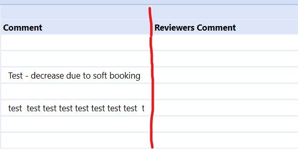 - When I type comment on the 'Comment' column, if the comments is of say 100 words, the red line which I marked in the screenshot keeps moving to the right. refer screenshot below. How can I fix this issue? I use, V#Annotation for Comment column.2. When multiple users, try to update the comments, the comment from the last save is only visible. Could you please advise how can i overcome this?