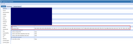 BRApi.Utilities.GetApplicationProperties(si).CurrencyFilter. Manipulate it with StringHelper.SplitString to get it as a List of String objects.