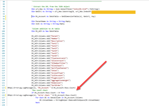 Use BRApi.ErrorLog.LogMessage to identify the line that is failing. TBH if the failing bit is in the screenshot you attached, this does not seem to be anything to do with OneStream as much as your payload not being what you expect it to be (either not something that can be parsed as correct json, or receiving an error from the external webservice about a parameter you should have passed).