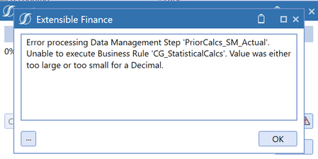 Hi, the issue is that your business rule CG_StatisticalCalcs tries to put a value in a parameter/ datatable/ object where the type of Decimal is expected. However the number that is processes is too big to fit in the Decimal specifications.