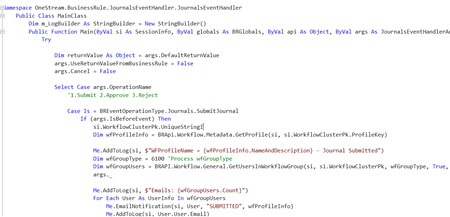Dim jourName as String = journal.Header.Header.NameIt also has examples of how to get user information if si.UserName is not what you want.