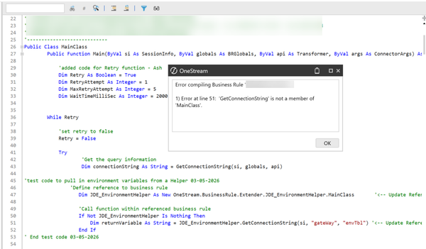 - Error at line 37: Type 'OneStream.BusinessRule.Extender.JDE_EnvironmentHelper.MainClass' is not defined.