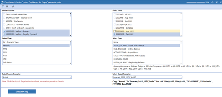 Selection Changed server Task Arguments: {Corp_Model_Utility_Copy_Actual}{CurCube=Planning,CurEntity=EQT_Import,CurParent=,CurConsol=USD,Prm_TargetScenario_QMC=[|!Prm_TargetScenario_QMC!|],Prm_SourceTime_QMC=[|!Prm_SourceTime_QMC!|],CurClear=False,Prm_SourceScenario_QMC=[|!Prm_SourceScenario_QMC!|],Prm_SourceAccount_QMC=|!Prm_SourceAccount_QMC!|,Prm_SourceView_QMC=|!Prm_SourceView_QMC!|,Prm_SourceFlow_QMC=|!Prm_SourceFlow_QMC!|}