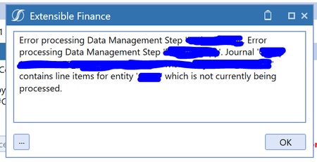 The cause of this error is due to data attempting to be copied from a journal when the Entity is not in the filter being used the DM step. In my case, my client made a JE that had multiple entities in the rows, but the DM step looked at WFCalcuationEntities which did not include all of the entities in the data copy. If you are copying using the DM Step data copy and ADJ is included in that copy, you need to make sure that all Entities are included in your Entity filter as it copies the whole journal and not just a single line or the lines in your Entity filter.