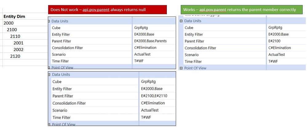 When debugging the BR, i can see api.pov.parent is returning nothing whenever multiple parent members are specified in the parent filter of the Data Management Step.