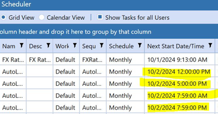 Hello, Has anyone seen this before where the task scheduler looks as if it will skip a date? Under the grid view, the autoloads highlighted are skipping 10/1/24 even though they are all set to run t...