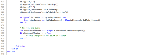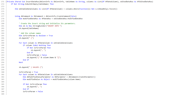 Now we are moving into the fun section of code. This opens with a Loop (For Each) of all our possible edited data. Then you see the Case Statement “editedDataRow.InsertUpdateOrDelete” This lets the application know that we want to apply the insert, update or delete functions to our available edited data rows variable. There is no easy part to the modified sections. Each of them takes their own separate lines of code that are functionally SQL Statements. As you can see from my previous screenshot, I have created three separate functions to dynamically run these queries. I will post these code snippets as an appendix to this blog. For the function of InsertDataRow, this is using the standard SL Insert statement.