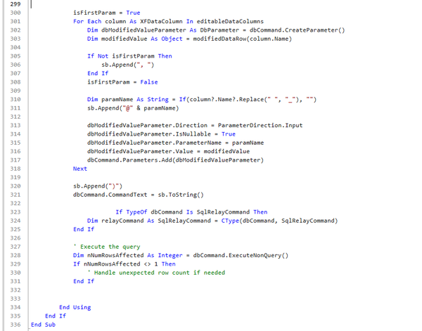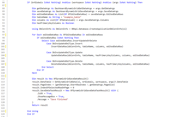 This is where we assign values to the XFDynamicGridSaveDataTaskResult. You’ll notice a With block—an idiomatic VB.NET construct that lets you set multiple properties on the same object without repeating the variable name. In other words, instead of writing result.IsOk = True, result.PageIndex = …, and so forth line by line, you can group them neatly inside one block.