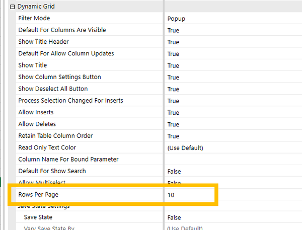- By default, Rows Per Page is set to -1, which means the grid uses your security settings to determine row limits.