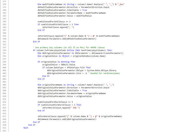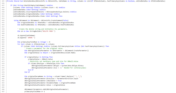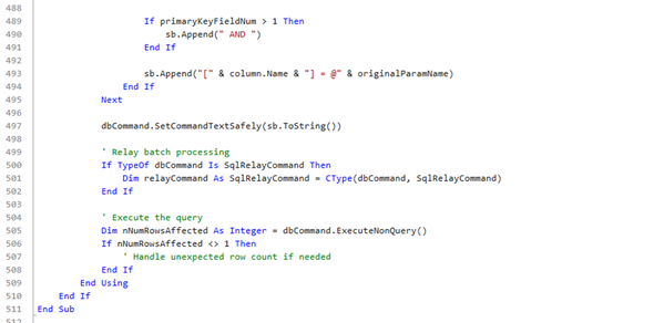 Now we get to the save loop. The routine starts with a For Each loop over the collection of edited rows. Inside the loop, a Select Case editedDataRow.InsertUpdateOrDelete directs the logic for each row, applying the appropriate insert, update, or delete operation.