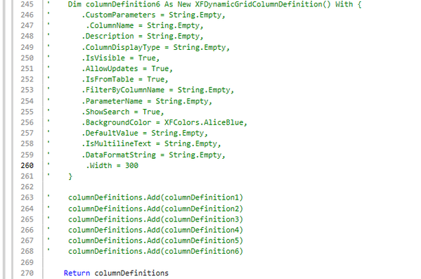 Inside the GetDynamicGridData function (see screenshot above), I added the following line: “Dim columnDefinitions As List(Of XFDynamicGridColumnDefinition) = Me.GetColumnDefinitions()”. This creates a list of XFDynamicGridColumnDefinition objects, which define the properties and formatting rules for each column in the grid. The call to Me.GetColumnDefinitions() retrieves these definitions from a dedicated function, keeping the logic clean and reusable.