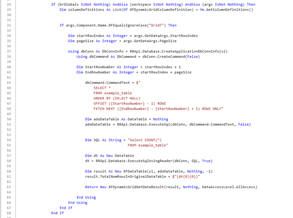 This step is non‑negotiable: you must send data back to the gird after the save. Without it, the grid will lose context and paging will break. That’s why this line is essential: “result.DataTable = GetDynamicGridData(si, brGlobals, workspace, args)?.DataTable” . By calling GetDynamicGridData again, you ensure the save result reflects the latest filters, sort order, and paging logic—keeping the user experience consistent after modifications. With the empty XFDynamicGridSaveDataResult created and the original data table rehydrated, the next step is to restore paging, so the user returns to the correct page after a save. Compute the current page index using VB.NET integer division: “result.PageIndex = (getDataArgs.StartRowIndex \ getDataArgs.PageSize)”.