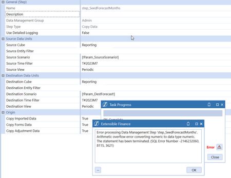 Hi, I've been using a data management step (part of an archival sequence) to copy data between Scenarios and archive data. It has worked well in the past but now I'm getting below error when I run the step. "Error processing Data Management Step 'step_SeedForecastMonths'. Arithmetic overflow error converting numeric to data type numeric. The statement has been terminated. (SQL Error Number -2146232060, 8115, 3621)" Any ideas as to what would be causing this ? I verified the data and I seems like the copy did work for the period selected however the error message still pops up. Thanks in advance! JT2.7KViews0likes3Comments"Cancelled by system" task status