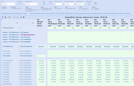 The following has been taken from the Tax Provision Blueprint "Instruction Guide" starting at page 194. See KB article: "Tax Provision Blueprint Instruction Guide - PV7.3.0 SV100" See KB article: "Data Integration" Dashboard DM 20a Admin – Provision Data: National (Group Filing: Yes or No) to Local (No GF) Select a WF entity and a Local Jurisdiction that you want the National Provision data to be copied into. This is the only copy schedule where you can also select “All JD’s”. If the “All Entities” check box is selected, then all the entities in the combo box will be copied or cleared. It does not matter what is in the entity POV; the check box supersedes the entity POV. We refer to this as a “bulk” copy or clear. If the “All JD’s” check box is selected, then all the JD’s in the combo box will be copied or cleared. It does not matter what is in the JD POV; the check box supersedes the JD POV. We refer to this as a “bulk” copy or clear. If the “All Entities” check box is not selected, then only the POV selected in the entity combo box will be copied or cleared. If the “All JD’s” check box is not selected, then only the POV selected in the JD combo box will be copied or cleared. You can mix and match these two check boxes. To have all entities and all JD’s copied or cleared, then both check boxes need to be selected. The bottom section of the toolbar will update with a “timestamp” with the last time a “bulk” copy or clear was executed. The timestamp will not be updated if the “All Entities” check box is not selected. The “All JD’s” is not considered for the timestamp. After a copy is completed, a 1 is entered to account TXP_Data_Copy_20a. A Cube View is supplied in the dashboard to show the user which Local Jurisdictions have copied data. We have created a flow member called “TXP_ConfirmBal_001” that holds the copied flow members. This parent member is strictly used to expand or collapse a row in the CV. The aggregated value is meaningless but shows you where there is data. Right click on any data cell and select “Drill Down”. Then expand the flow dimension to see the breakdown of the three accounts.
