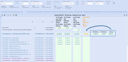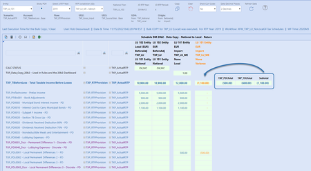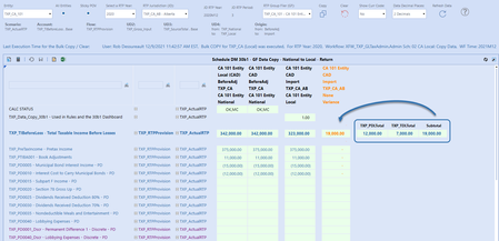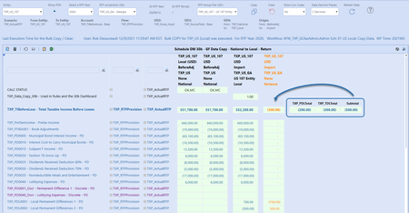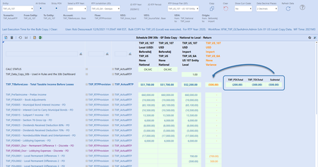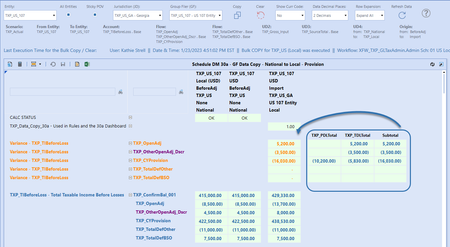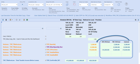 The following has been taken from the Tax Provision Blueprint "Instruction Guide" starting at page 203. See KB article: "Tax Provision Blueprint Instruction Guide - PV7.3.0 SV100" See KB article: "Data Integration" Dashboard DM 30a – Provision Data: National (Group Filing: Yes or No) by Local (Group Filing) Select a WF entity, a Local Jurisdiction, and a Group Filer entity (UD7) that you want the Local Provision data to be copied into. This schedule can only copy or clear one POV at a time. The bottom section of the toolbar may have a “timestamp” with the last time a “bulk” copy or clear was executed. This can only be done via Sch DM30aAdmin. After a copy is completed, a 1 is entered to account TXP_Data_Copy_30a. A Cube View is supplied in the dashboard to show the user which Entity and National Jurisdiction has been copied to which Entity, Local Jurisdiction and Group Filer entity (UD7). The last three columns help explain the variance for data that has been entered in local only permanent or temporary difference accounts. We have created a flow member called “TXP_ConfirmBal_001” that holds the copied flow members. This parent member is strictly used to expand or collapse a row in the CV. The aggregated value is meaningless but shows you where there is data.DM 30a Admin – Provision Data: National (Group Filing: Yes or No) by Local (Group Filing)