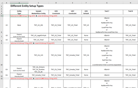 The following has been taken from the Tax Provision Blueprint "Instruction Guide" starting at page 49. See KB article: "Tax Provision Blueprint Instruction Guide - PV7.3.0 SV100" See KB article: "Dimension Member Names - Renaming and Deleting" See KB article: "Dimension Text Fields - Summary" Entities XFW_TXP_Entities is the Tax Provision Blueprint sample Entity Dimension. It is provided with sample entities to show Reporting and Forms. A Legal or Tax reporting structure should be built in the XFW_TXP_Entities Dimension if the desired entity structure is not available in the Financial Model Entities Dimension. If the design decision is made to use the XFW_TXP_Entities, we recommend that this structure share base entity members (through a linked cube setup) with an existing finance structure that is used for consolidation. If distinct base entities must be created for tax, we recommend adding a _TXP suffix to each Entity Member (Houston_TXP). This makes writing Business Rules and Entity mapping easier and consistent across solutions. The sample entities that are included in XFW_TXP_Entities should be used as a reference for how to set up the Text properties for various situations, including National and Local Jurisdictions. Prior to data entry, all sample entities should be removed, except the TXP_GLTaxAdmin – Global Tax Admin entity. If the XFW_TXP_Entities Dimension is replaced as the assigned Entity Dimension for the XFW_TXP Cube, the TXP_GLTaxAdmin – Global Tax Admin entity must be removed from XFW_TXP_Entities and created in the Legal/Tax Hierarchy in the Entity Dimension that is being used. Do not change the Member Properties that are initially assigned to TXP_GLTaxAdmin – Global Tax Admin. The Tax Provision Blueprint application will not function properly without the TXP_GLTaxAdmin entity in the assigned Financial Model Entity Dimension under the Tax/Legal Hierarchy that is used. The TXP_GLTaxAdmin entity should be a sibling to the main Tax Entity hierarchy (TXP_Legal_CTX in Tax Provision Blueprint). The Tax Provision Blueprint application uses the Entity / Jurisdiction (UD1) grouping to help drive the results. UD1 is the Tax Jurisdiction that corresponds with the National (country) and Local Jurisdictions (where applicable) in which the legal entity will be taxed. There can only be one national jurisdiction associated with an entity. Each Entity Member (includes all entities added to XFW_TXP_Entities or the current entities in the substituted Financial Model Entity Dimension for Tax/Legal hierarchy) must add the following Entity Member Properties. Follow the guidelines in the Entity / UD1 Table below for sample setups. Entity Notes: General Alternate hierarchies can be used. All parent members must have the word Total in the description. This will help in the formatting of Cube Views. If intercompany (IC) is needed in the app., then flag the appropriate base level entities as “Is IC Entity=True”. UD1 Constraint Used on all entities (base and parents) – this drives the Finance Business Rule to execute. Limit’s what is a valid intersection. UD7 Constraint Used on all base level entities and up to country level parent entities. Limit’s what is a valid intersection. UD1 Default Used on all base level entities but not required on parent entities. Text 7 Used on any base entity that calculates both a National and a Local tax provision and calculates a National Benefit for the Local data (such as U.S. Federal Benefit of State): NatBenefit=Yes. Also used to tell the app if an entity is a Filer (only used for group filing – either National or Local): NatFiler=Yes and / or LocalFiler=Yes – base entity only. If a base entity requires more than one setting, use a comma to separate the two settings. NatBenefit=Yes,NatFiler=Yes,LocalFiler=Yes All other base entities – leave the property blank. All sub-country/country level parent entities – leave the property blank. At parent entities above the country level, use SETR=No to stop the parent entity from appearing on the Statutory Waterfall reports. Text 8 Required for all Tax entities (base and parent level). This is used to help determine the UD1 members. UD1 member that will vary by entity: base entity that calculates both a National and a Local tax provision; base entity that calculates only a National tax provision; parent entity. Here is a more detailed list of what each entity setting represents: UD1 Constraint: This limits the valid UD1 jurisdictions available for the entity. This ensures that invalid jurisdictions are not available for data entry (i.e., using a Germany JD on a US entity). For entities that have local jurisdictions, this member should be a parent (i.e., Entity: TXP_US_101 -> UD1 Constraint: TXP_US_Total). If there are no local jurisdictions for the entity, then the UD1 Constraint should be the National JD (i.e.: Entity: TXP_UK_101 -> UD1 Constraint: TXP_UK). For entity parents above the country level, use the member TXP_TotalNational. Note: If Finance is using or planning to use UD7 Constraints, UD1 Defaults, Text 7, or Text 8 fields, then it’s suggested to use the “Tax” / “ScenarioType7” / “ScenarioType8” Scenario Types and any other scenario types that are utilized in the tax cube. UD7 Constraint: This limits the valid UD7 group filing entities available for the entity. This ensures that invalid group filing entities are not available to enter data into (i.e.: using a Canadian group filer entity on a US entity). The UD7 Constraint should be the parent country member (Entity: TXP_CA_115 -> UD7 Constraint: TXP_Canada_Total). If an entity is not part of a group filing country (either National or Local), then use “None”. Parent entities above the country level should also be “Root”. UD1 Default: For base level entities and parent country entities, use the National jurisdiction (i.e. Entity: TXP_UK_Total -> UD1 Default: TXP_UK). For parent entities above the country level, use the
