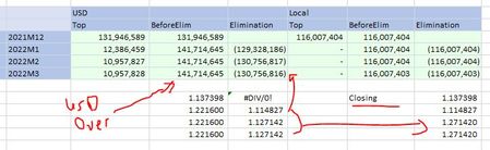 Our Currency Override formula in the Flow Dim (EndBal_Input) has been working great, no issues. We have been using IC Elim's on all of our Balance Sheet accounts except Equity/Investments. All of our E/I accounts are Currency overrides. We turned this IC on in January and are now noticing that the Elim amt is the FX calc'ed value and not the Currency Override value. Thus not zeroing out at O#:Top. Not sure how to adjust the O#Elimination member at the parent level for IC members. Any suggestions on how I might go about fixing. Not sure if I need to include a fourmla in the Flow Dim to handle different Origins or if it is handled elsewhere. Just looking for ideas to think about. In my example below you can see the Elim amount is using the Closing FX rate and not the Fixed USD amt or rate. Clarke2.8KViews0likes4Comments