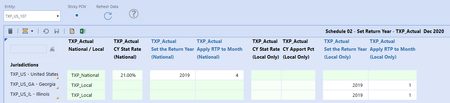 The following has been taken from the Tax Provision Blueprint "Instruction Guide" starting at page 423. See KB article: "Tax Provision Blueprint Instruction Guide - PV7.3.0 SV100" See KB article: "Troubleshooting the Schedules" Schedule 02 RTP Dashboard Name Sch02_RTP (TXP) Entity No entity is showing up in the drop-down box. Parameter used: WF_TaxEntities_WFText2_P1_TXP Defined as: {TXP_HelperQueries}{GetEntityText7_byWFTime}{} WF Text 1 – needs to contain “LocalGroupFiler=Yes” or “NatGroupFiler=Yes” WF Text 2 – needs to have the country level entity .Base (i.e. E#TXP_US_Total.Base) Base level entities Text 7 must contain “LocalFiler=Yes” and/or “NatFiler=Yes” UD1 Jurisdiction (JD) No Jurisdictions are showing up in the drop-down box: Parameter used: UD1_JD_Master_LV_TXP Defined as: XFBR(TXP_ParamHelper, DetermineUD1, ScenarioName=|WFScenario|, EntityName=|!WF_TaxEntities_WFText2_P1_TXP!|) WF Text 3 – position 1 (i.e., U1#TXP_US_Local.Base)Troubleshooting - Schedule 02 Set the Return Year