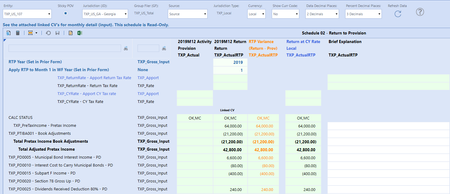 The following has been taken from the Tax Provision Blueprint "Instruction Guide" starting at page 424. See KB article: "Tax Provision Blueprint Instruction Guide - PV7.3.0 SV100" See KB article: "Troubleshooting the Schedules" Schedule DM 01a Actual Nat GF – Copy Definitions This dashboard is only used on the XFW_TXP_GLTaxAdmin workflow. It is only used to do a complete copy of National group filing definitions from one time period to another. No input is permitted in the schedule. Dashboard Name SchDM01a_Actual Nat Group Filings (TXP) Entity No entities are showing up in the rows of the CV: E#XFBR(TXP_ParamHelper, GetWFText2, position=1, Sort=Yes) UD1 Jurisdiction (JD) No Jurisdictions are showing up in the rows of the CV: U1#|!UD1_JD_WFText3_P1_LV_TXP!|.Where(Text1 Contains TXP_National) defined as: XFBR(TXP_ParamHelper, GetWFText3, Position=1) UD7 Group Filer Entity No UD7 are showing up in the rows of the 2nd CV: U7#XFBR(TXP_ParamHelper, GetWFText3, position=3) Difference column This column is defined with the following syntax: GetDataCell(BR#[BRName=TXP_CV_CompareAnnotation, FunctionName=Compare, SourceScenario=TXP_Actual, DestScenario=TXP_Actual, GF=Nat, SourceTime=|!SourceTimePeriod_TXP!|, DestTime=|!DestinationTimePeriod_TXP!|]):Name(“Difference”) TXP_NatFileCalc column No “1.00” are showing up after the “Copy” icon has been launched: In order for the following rule to execute (TXP_NatFilerCalc), the following metadata setup is required: Scenarios must be either “TXP_Actual” or “TXP_ActualRTP” UD1 Text 2 on the National JD must contain “NatGF=Yes” The top CV must have some definitions defined Row Suppress on the Top CV In order to have suppress working in this CV, we have a hidden column that is defined with a dynamic UD8 member (TXP_NatFiler) that populates a “1” when there are cell text / annotations. Suppression does not work on annotations. Therefore, we need this hidden column to dynamically populate a “1” so that row suppression will work. This UD8 member BR is defined as follows:Troubleshooting - Schedule 02 RTP