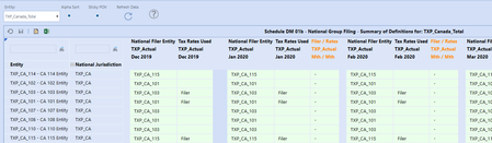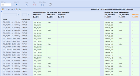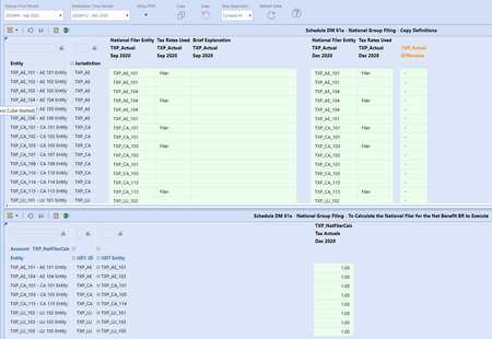 The following has been taken from the Tax Provision Blueprint "Instruction Guide" starting at page 426. See KB article: "Tax Provision Blueprint Instruction Guide - PV7.3.0 SV100" See KB article: "Troubleshooting the Schedules" Schedule DM 01b Actual Nat GF – Summary of the Definitions This dashboard is only used on the XFW_TXP_GLTaxAdmin workflow. It is only used to show the National group filing definitions for all periods in the workflow year. It has several compare columns to show any differences from the prior period. No input is permitted in the schedule. It shows all entities for the National JD with suppressed rows with no data turned on. Dashboard Name SchDM01b_Actual Nat Group Filings (TXP) Entity Entities are based on the following parameter: |!Tax_Entities_AllParents_TopEntity_TXP!| Defined as: XFBR(TXP_ParamHelper, Entities_Sorted_AllParents, Sort_Entities_TF=|!Tax_Entities_Sorted_TF_TXP!|) The “Alpha Sort” check box is based on the following parameter: |! Tax_Entities_Sorted_TF_TXP!| Difference column This column is defined with the following syntax: GetDataCell(BR#[BRName=TXP_CV_CompareAnnotation, FunctionName=Compare, SourceScenario=TXP_Actual, DestScenario=TXP_Actual, GF=Nat, SourceTime=|!WFYearPrior1_M12_LV_TXP!|, DestTime=|WFYear|M1]):Name(“Mth / Mth”)Troubleshooting - Schedule DM 01a Actual Nat GF – Copy Definitions
