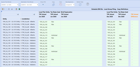 The following has been taken from the Tax Provision Blueprint "Instruction Guide" starting at page 429. See KB article: "Tax Provision Blueprint Instruction Guide - PV7.3.0 SV100" See KB article: "Troubleshooting the Schedules" Schedule DM 02b Actual Local GF – Summary of the Definitions This dashboard is only used on the XFW_TXP_GLTaxAdmin workflow. It is only used to show the Local group filing definitions for all periods in the workflow year. It has several compare columns to show any differences from the prior period. No input is permitted in the schedule. It shows all entities for all Local JD’s with suppressed rows with no data turned on. Dashboard Name SchDM02b_Actual Local Group Filings (TXP) Entity Entities are based on the following parameter: |!Tax_Entities_AllParents_TopEntity_TXP!| Defined as: XFBR(TXP_ParamHelper, Entities_Sorted_AllParents, Sort_Entities_TF=|!Tax_Entities_Sorted_TF_TXP!|) The “Alpha Sort” check box is based on the following parameter: |! Tax_Entities_Sorted_TF_TXP!| Difference column This column is defined with the following syntax: GetDataCell(BR#[BRName=TXP_CV_CompareAnnotation, FunctionName=Compare, SourceScenario=TXP_Actual, DestScenario=TXP_Actual, GF=Local, SourceTime=|!WFYearPrior1_M12_LV_TXP!|, DestTime=|WFYear|M1]):Name(“Mth / Mth”)Troubleshooting - Schedule DM 02a Actual Local GF – Copy Definitions