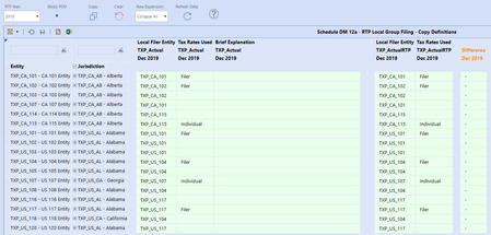 The following has been taken from the Tax Provision Blueprint "Instruction Guide" starting at page 430. See KB article: "Tax Provision Blueprint Instruction Guide - PV7.3.0 SV100" See KB article: "Troubleshooting the Schedules" Schedule DM 12a ActualRTP Local GF – Copy Definitions This dashboard is only used on the XFW_TXP_GLTaxAdmin workflow. It is only used to do a complete copy of Local group filing definitions for the RTP year from the TXP_Actual scenario to the TXP_ActualRTP scenario for period M12 (Dec). No input is permitted in the schedule. Dashboard Name SchDM12a_Actual Local Group Filings (TXP) Entity No entities are showing up in the rows of the CV: E#XFBR(TXP_ParamHelper, GetWFText2, position=1, Sort=Yes) UD1 Jurisdiction (JD) No Jurisdictions are showing up in the rows of the CV: U1#|!UD1_JD_WFText3_P1_LV_TXP!| defined as: XFBR(TXP_ParamHelper, GetWFText3, Position=1) Difference column This column is defined with the following syntax: GetDataCell(BR#[BRName=TXP_CV_CompareAnnotation, FunctionName=Compare, SourceScenario=TXP_Actual, DestScenario=TXP_Actual, GF=Local, SourceTime=|!SourceTimePeriod_TXP!|, DestTime=|!DestinationTimePeriod_TXP!|]):Name(“Difference”) Row Suppress on the Top CV In order to have suppress working in this CV, we have a hidden column that is defined with a dynamic UD8 member (TXP_LocalFiler) that populates a “1” when there are cell text / annotations. Suppression does not work on annotations; therefore, we need this hidden column to dynamically populates a “1” so that row suppression will work. This UD8 member BR is defined as follows:Troubleshooting - Schedule DM 11a ActualRTP Nat GF – Copy Definitions