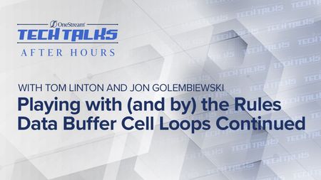 Listen to the latest episode of The OneStream podcast below! On this edition of The OneStream Podcast, Peter Fugere is joined by Jannesa Zhang, Matt Ha, and Eric Hanson to discuss their new book, OneStream Administrator Handbook. The authors discuss the inspiration for the book and how it can help OneStream administrators gain an appreciation of the OneStream application and provide the tools needed to tackle a wide variety of administrative actions that may surface.407Views2likes0CommentsTitle – Tech Talks After Hours: Playing with (and by) the Rules – Data Buffer Cell Loops Continued